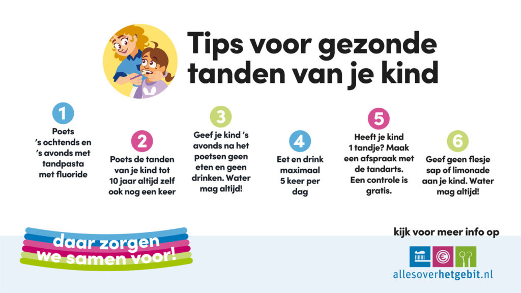 Tip voor een gezonde kindermond: poets ’s ochtends en ’s avonds met tandpasta met fluoride. Vanaf het moment dat het eerste tandje is doorgebroken, moet